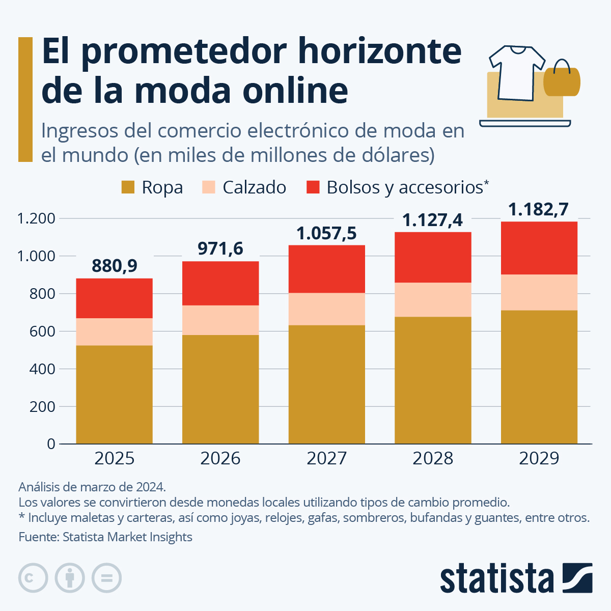 Según datos de Statista, los ingresos generados por las ventas online en el sector de la moda no solo se han mantenido, sino que siguen creciendo a ritmo acelerado. Este 2025, se estima que la facturación mundial del ecommerce en moda alcanzará los 880.900 millones de euros, siendo la ropa el segmento con mayor participación: cerca de 523.000 millones de euros.
