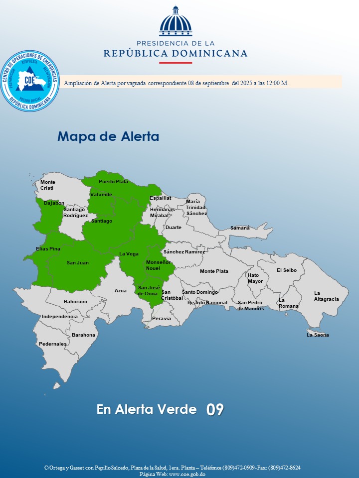 Santo Domingo, R.D. – La Dirección del Centro de Operaciones de Emergencias (COE) informó este lunes que amplía el nivel de alerta verde en nueve provincias del país, ante el pronóstico de condiciones meteorológicas inestables para la tarde y noche de hoy.