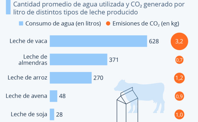 La leche de vaca es la menos sostenible entre las principales opciones de leches vegetales y animales, según un análisis basado en datos de la revista Science, publicado por The New York Times y recogido por Statista. Cada litro de leche de vaca consume 628 litros de agua y genera 3,2 kg de CO₂, una huella ecológica muy superior a la de sus alternativas vegetales.
