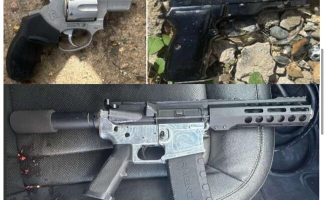 En el operativo se incautaron cinco armas de fuego: un fusil AR-15 calibre 5.56, color plateado con negro, con un cargador de 40 cartuchos; una ametralladora Uzi calibre 9 milímetros con su cargador; un revólver Taurus calibre 38, serie ACA479069, color plateado; una pistola Glock calibre 9 milímetros, serie AFNP488, con cargador; y una pistola Carandai color negro, sin numeración visible, con su cargador.