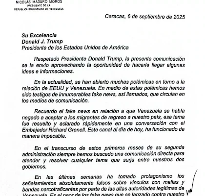 La carta fue divulgada por la vicepresidenta de Venezuela, Delcy Rodríguez, varios días después de que Estados Unidos ordenara ataques contra cuatro embarcaciones cargadas de cocaína de presuntos narcotraficantes venezolanos.