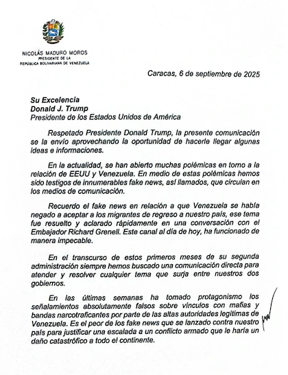 La propuesta está contenida en una comunicación con fecha del 6 de septiembre que Maduro le remitió al presidente estadounidense Donald Trump.