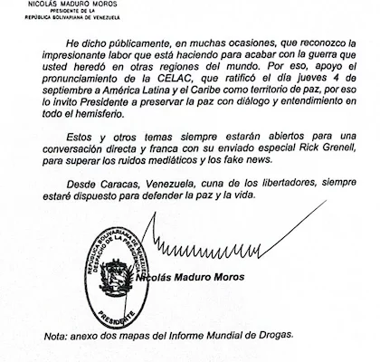 Sin embargo, en la comunicación, Maduro precisa que los señalamientos sobre sus vínculos con mafias y bandas narcotraficantes son "absolutamente falsos".