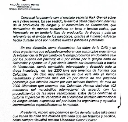 En el documento, el gobierno chavista se declara víctima de información falsa, por lo cual considera que Estados Unidos ha desplegado una operación militar con el pretexto de combatir el narcotráfico en el Caribe y en el Pacífico.