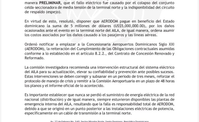 La Comisión Aeroportuaria asimismo, resaltó que “es importante establecer que nunca se perdió el suministro de energía eléctrica de la red nacional (distribución) y de igual manera, siempre estuvieron disponibles las plantas de emergencia interna del AILA, resultando que la falla es responsabilidad total de AERODOM, debido a que se originó en un punto posterior a las instalaciones eléctricas de potencia, específicamente en un cable de transmisión a la terminal norte”.