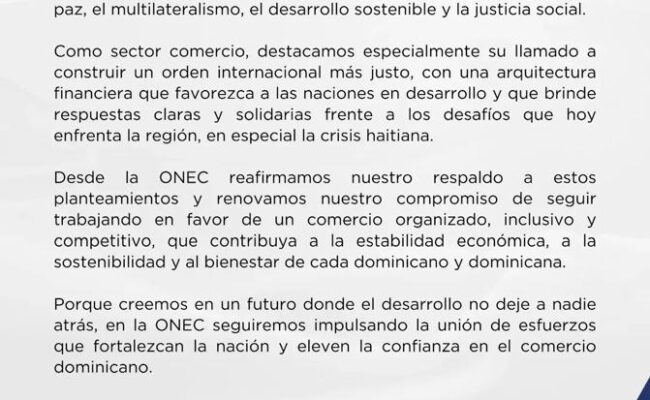 La ONEC afirmó que reafirma su respaldo a esos planteamientos y renueva el compromiso de seguir trabajando en favor de un comercio organizado, inclusivo y competitivo que contribuya a la estabilidad económica, a la sostenibilidad y al bienestar de cada dominicano y dominicana.