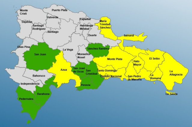 Mientras que las provincias en alerta verde son Barahona, Peravia, Pedernales, San Juan, San José de Ocoa, San Cristóbal y Sánchez Ramírez.