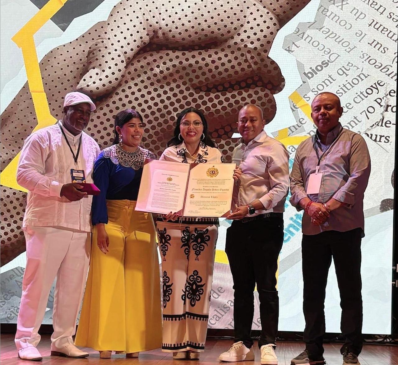 Durante la clausura de la jornada, la diputada Didiez recibió la Medalla al Mérito, Antonia López, por su liderazgo regional, la defensa de los derechos afrodescendientes y de Pueblos Indígenas, y los aportes a la integración centroamericana.