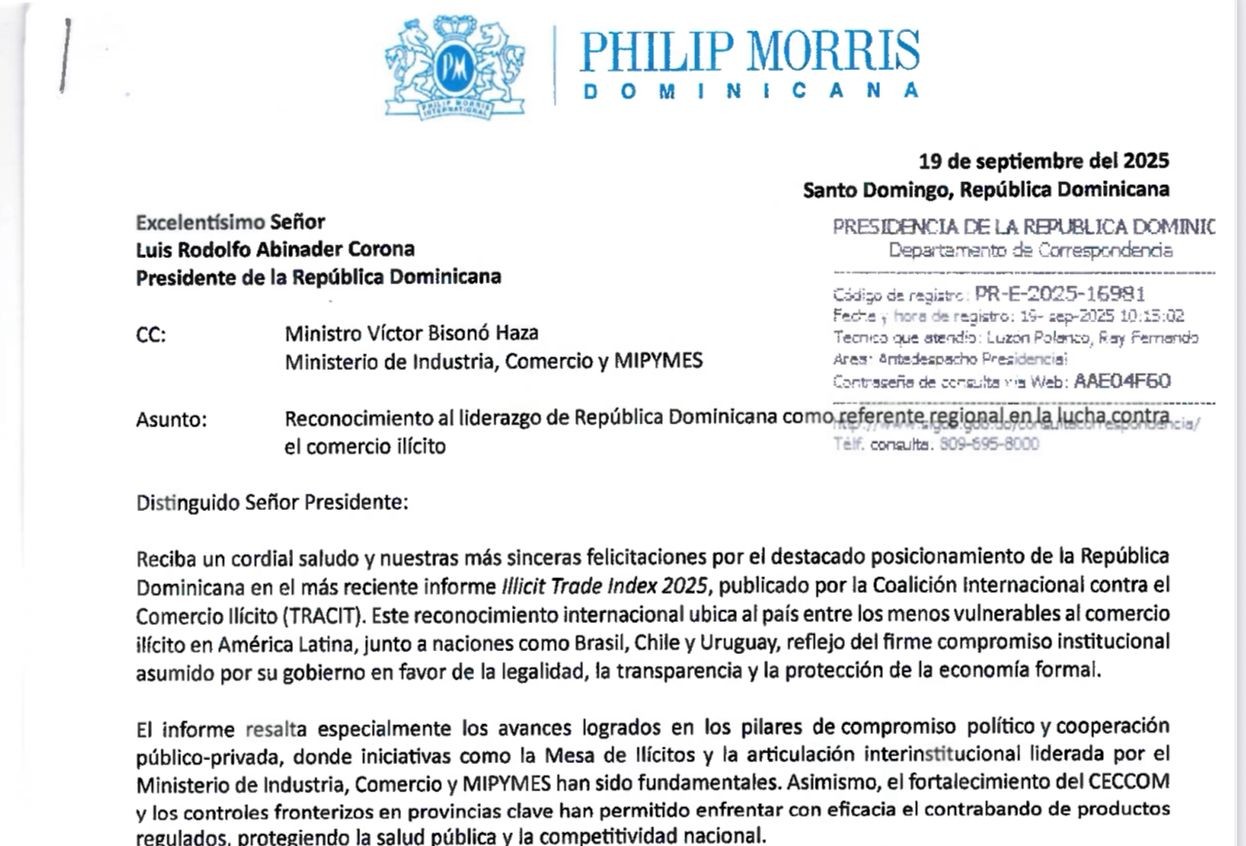 “Este reconocimiento ubica a la República Dominicana entre los países menos vulnerables al comercio ilícito en América Latina y refleja un liderazgo en favor de la legalidad, la transparencia y la protección de la economía formal”, señala la carta firmada por Alberto Recio Ramos, director general de Philip Morris Dominicana, y Andrés J. Espinal, director de Asuntos Externos de PMI Centroamérica, Caribe y Región Andina.