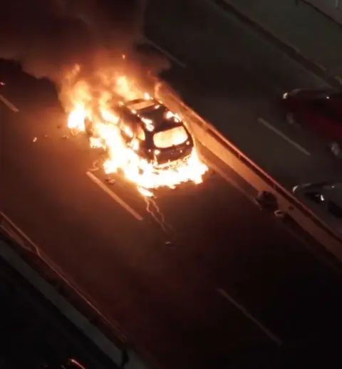 Un vehículo se incendió la noche de este sábado en el elevado de la avenida John F. Kennedy con Abraham Lincoln, en el Distrito Nacional, generando una fuerte congestión vehicular en la zona.