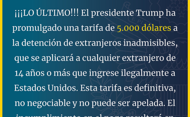 “El presidente Trump ha promulgado una tarifa de 5.000 dólares a la detención de extranjeros inadmisibles, que se aplicará a cualquier extranjero de 14 años o más que ingrese ilegalmente a Estados Unidos”, publicó la legación norteamericana en la República Dominicana.