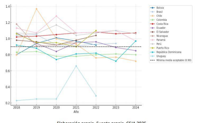 El estudio indica que República Dominicana, redujo en un 30% su tasa de congestión judicial entre 2023 y 2024 y alcanzó una tasa de resolución de 0.97, superando los niveles previos a la pandemia y situándose en el tercer lugar regional, solo detrás de Costa Rica (1.07) y Perú (1.06, cuya tendencia fue a la baja).
