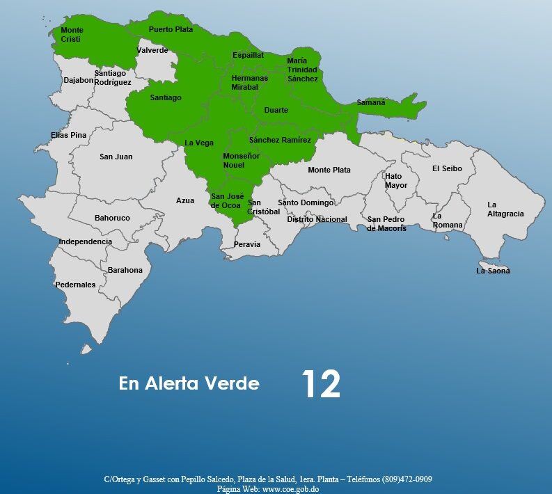 Las provincias bajo alerta son Espaillat, Samaná, Hermanas Mirabal, Montecristi, María Trinidad Sánchez, Monseñor Nouel, La Vega, San José de Ocoa, Duarte, Santiago, Puerto Plata y Sánchez Ramírez.