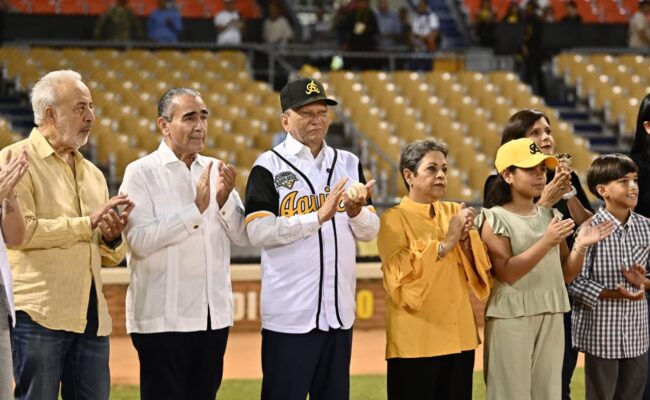 Leonardo Aguilera lanza la primera bola en partido inaugural del torneo de béisbol en el Estadio Cibao