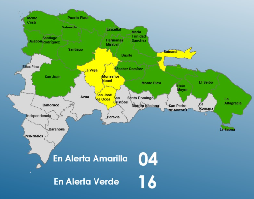 En alerta verde figuran otras 16 demarcaciones, entre ellas: Valverde, Puerto Plata, Espaillat, María Trinidad Sánchez, Monte Plata, Hato Mayor, San Cristóbal, el Gran Santo Domingo y San Pedro de Macorís, entre otras.