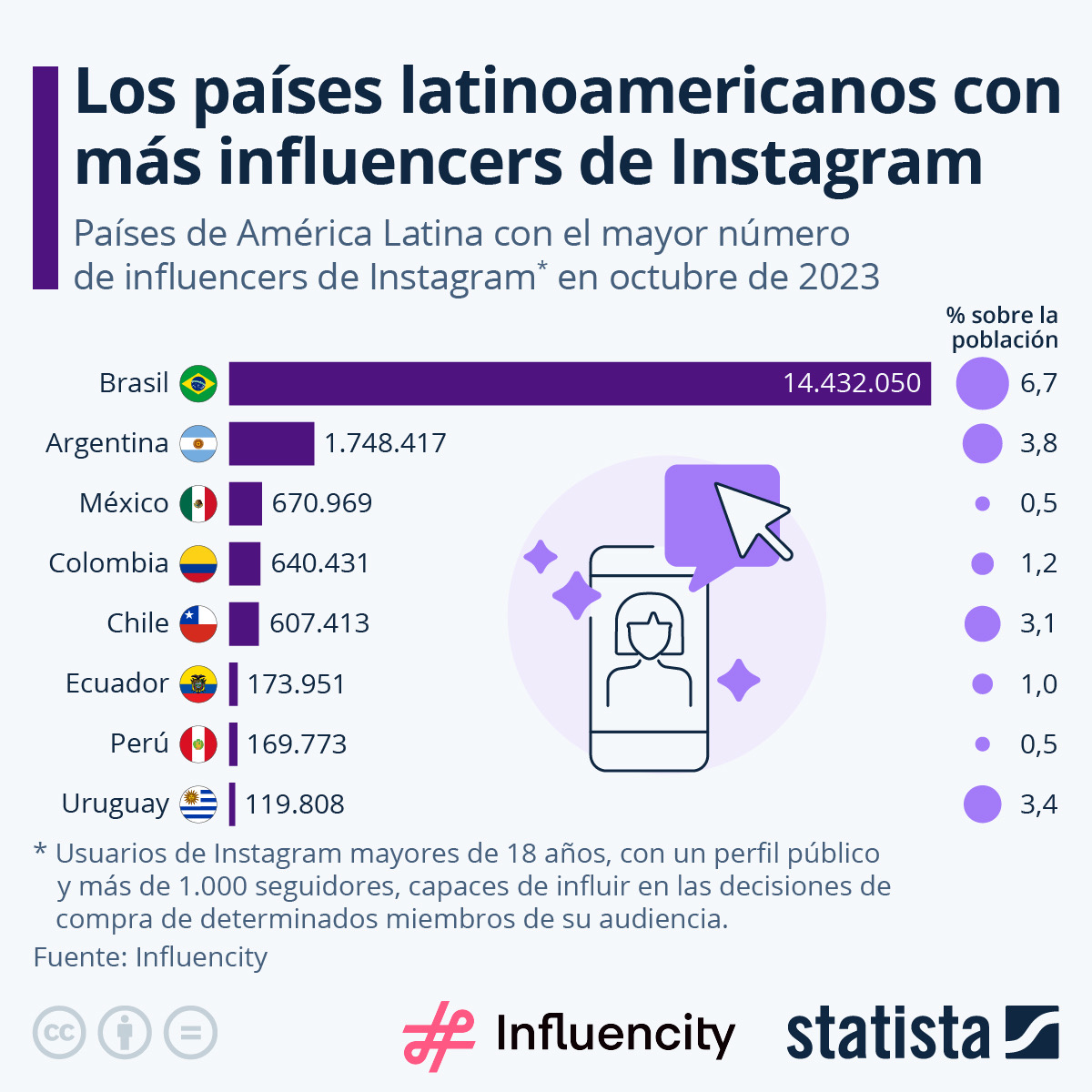 De acuerdo con el informe, Brasil lidera ampliamente la región con 14,4 millones de influencers, lo que representa más del 76 % del total latinoamericano. Además, cerca del 7 % de los brasileños fueron identificados como influencers, convirtiendo al país en el de mayor penetración de este fenómeno en proporción a su población.