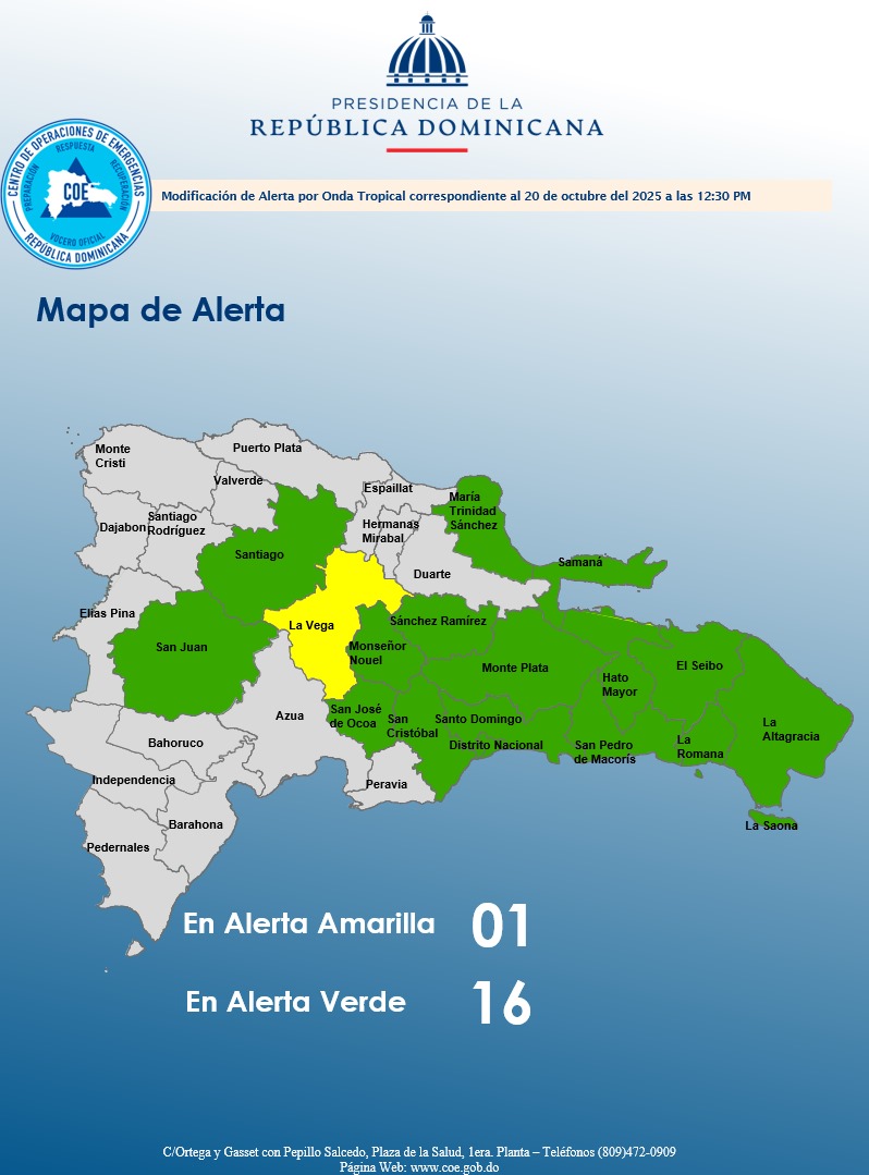 Santo Domingo, 20 de octubre de 2025 – El Centro de Operaciones de Emergencias (COE) informó este lunes que mantiene una provincia en alerta amarilla y 16 en alerta verde, ante la amenaza de inundaciones repentinas urbanas y rurales, crecidas de ríos, arroyos y cañadas, así como deslizamientos de tierra, debido a una activa onda tropical asociada a un centro de baja presión con alta probabilidad de convertirse en ciclón tropical en las próximas 48 horas.