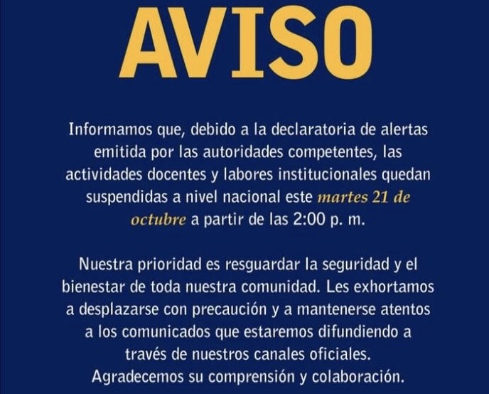 La institución explicó que la decisión busca proteger la seguridad y el bienestar de estudiantes, docentes y personal administrativo frente a las condiciones adversas generadas por la Tormenta Tropical Melissa, que continúa incidiendo sobre gran parte del territorio nacional.