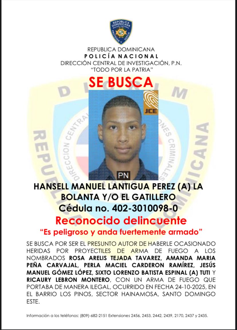 Santo Domingo, RD.- La Policía Nacional informó este viernes que ha activado la búsqueda de un reconocido antisocial, señalado como el presunto responsable de causar heridas de bala a seis personas durante un conflicto social ocurrido en una fiesta clandestina la noche del miércoles 23 de octubre, en el sector Los Pinos de Hainamosa, municipio Santo Domingo Este.