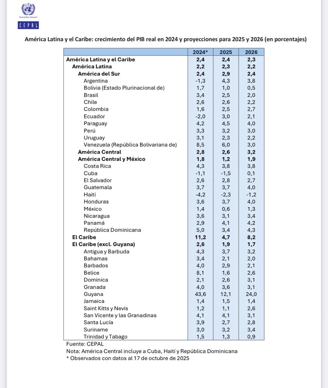 La Comisión Económica para América Latina y el Caribe (CEPAL) actualizó este octubre de 2025 sus proyecciones económicas y estima que el producto interno bruto (PIB) regional crecerá 2,4% en 2025 y 2,3% en 2026. La nueva estimación para 2025 representa una revisión al alza respecto al 2,2% previsto en agosto, y mantiene el mismo nivel que el presentado en diciembre de 2024.