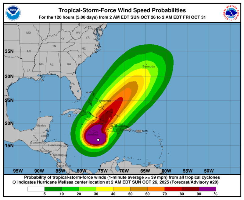 El fenómeno se ubica cerca de la latitud 16.3 norte y longitud 76.3 oeste, aproximadamente a 195 kilómetros al sur/sureste de Kingston, Jamaica y 450 kilómetros al sur/suroeste de Guantánamo, Cuba, desplazándose lentamente hacia el oeste a unos 7 km/h.