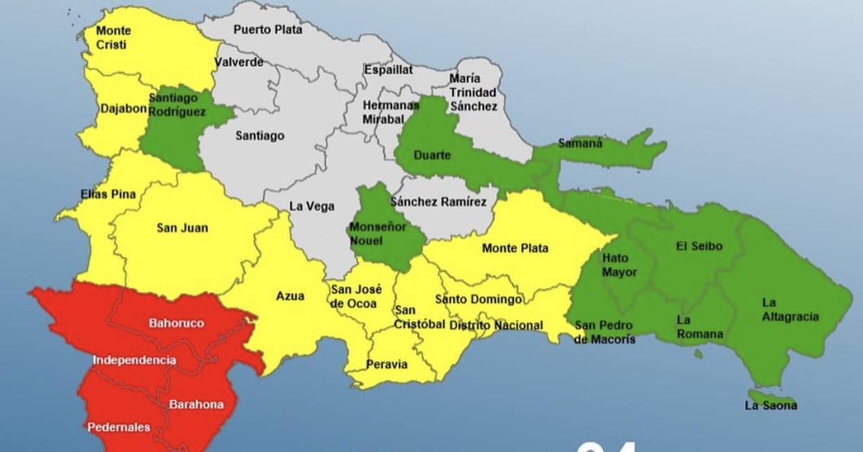 Las provincias en alerta roja son Barahona, Pedernales, Independencia y Bahoruco, donde las lluvias han incrementado el riesgo de inundaciones repentinas y deslizamientos de tierra. En alerta amarilla se encuentran San José de Ocoa, Elías Piña, Dajabón, Azua, Santo Domingo, Distrito Nacional, San Cristóbal, Peravia, Monte Plata, San Juan y Monte Cristi. Mientras que en verde están Monseñor Nouel, San Pedro de Macorís, Duarte, La Romana, Hato Mayor, La Altagracia, El Seibo, Santiago Rodríguez y Samaná.