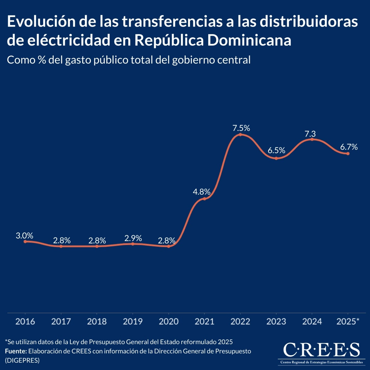 Santo Domingo, RD.- Un análisis publicado por el Centro Regional de Estrategias Económicas Sostenibles, CREES, revela que en los últimos años, las transferencias del Gobierno central a las empresas distribuidoras de electricidad (EDE) se han mantenido como uno de los principales componentes del gasto público. De acuerdo con datos oficiales resumidos por el CREES, en 2024 representaron el 7.3% del gasto total, y para 2025 se proyecta que equivalgan al 6.7%. En términos de producto interno bruto, estas transferencias en el 2025 equivaldrían al 1.3%, una proporción superior al promedio de la última década.