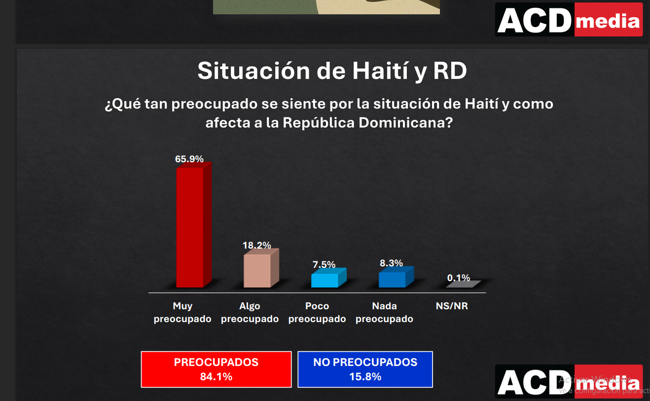 Santo Domingo.-Una amplia mayoría de los dominicanos (65.9 %) se declara muy preocupada por la situación política, económica y social de Haití y cómo esta afecta a la República Dominicana, según los resultados de una reciente encuesta nacional. Además, un 18.2 % dice sentirse algo preocupado, mientras que apenas el 7.5 % manifiesta estar poco preocupado y un 8.3 % asegura no estar nada preocupado. Un 0.1 % prefirió no responder.