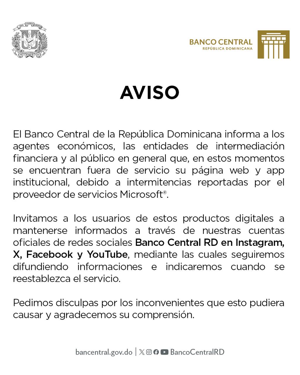El Banco Central de la República Dominicana (BCRD) informó este miércoles que tanto su página web como su ajap institucional se encuentran temporalmente fuera de servicio, debido a intermitencias técnicas reportadas por el proveedor de servicios Microsoft.