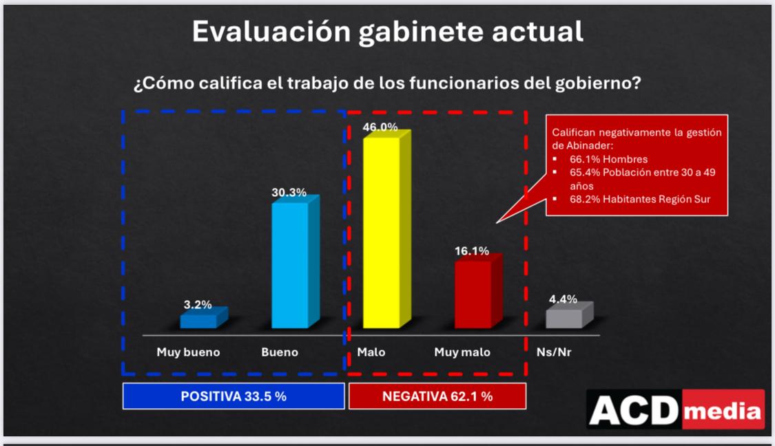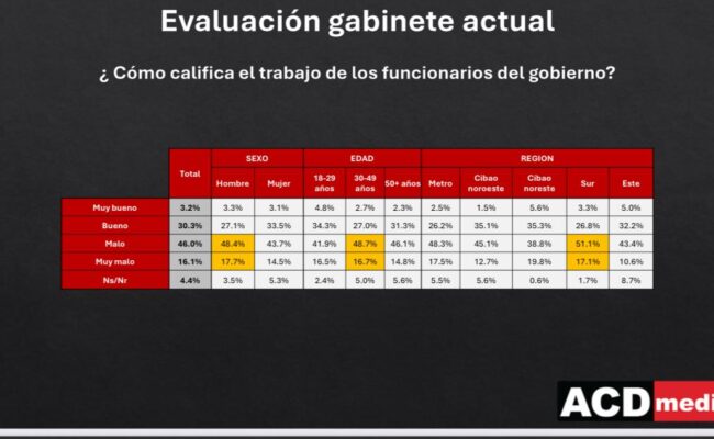 Santo Domingo, RD.- Más de la mitad de la población, un 62.1 por ciento, valora negativamente las ejecutorias del gabinete del presidente Luis Abinader calificándola como mala, un 46%, o muy mala, un 16.1 por ciento.