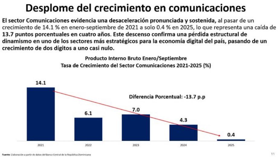 Santo Domingo.-El sector comunicaciones registró un crecimiento nulo de 0.4% entre enero y septiembre de 2025, marcando el punto más bajo de los últimos cinco años y evidenciando una desaceleración persistente. Esta situación genera inquietud entre las autoridades, que además expresan preocupación por la difusión de noticias falsas en redes sociales.