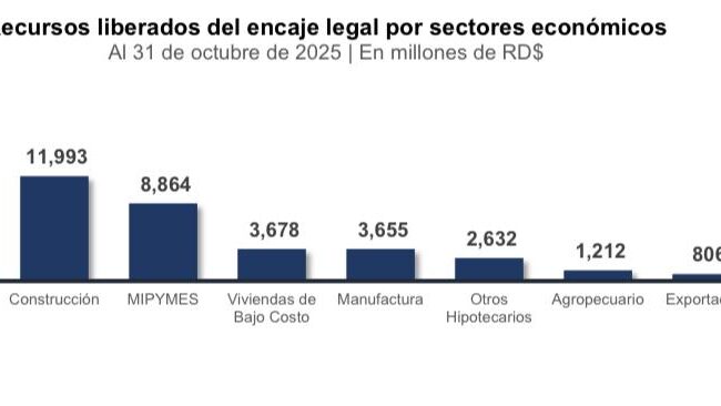 Los recursos liberados del encaje legal se destinaron a los sectores de comercio RD$21,528 millones, construcción RD$11,993 millones, MIPYMES RD$8,864 millones, manufactura RD$3,655 millones, agropecuario RD$1,212 millones y exportación RD$806 millones. Dichos desembolsos incluyen RD$3,678 millones para la adquisición de viviendas de bajo costo por parte de familias de bajos recursos y RD$2,632 millones para préstamos hipotecarios en sentido general”, señaló.