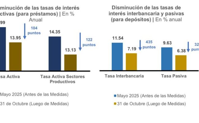 “Durante el mismo período de análisis, las tasas de interés interbancarias observaron reducciones de 11.54 % en el mes de mayo a 7.19 % en octubre de 2025, completando una disminución mayor a 435 puntos básicos. De igual manera, las tasas pasivas se redujeron de 9.63 % a 6.38 % en el mismo intervalo de tiempo, para un descenso en torno a 325 puntos básicos.”
