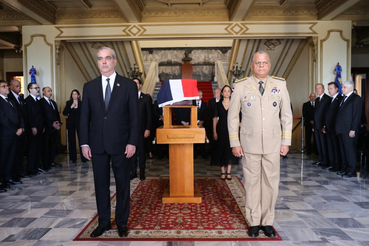 El Funeral de Estado inició a las 3:00 de la tarde en el Palacio Nacional, con el recibimiento de los restos del héroe y la llegada del mandatario, acompañado de la primera dama, Raquel Arbaje; la vicepresidenta, Raquel Peña; y diversos ministros y autoridades civiles, militares y eclesiásticas.