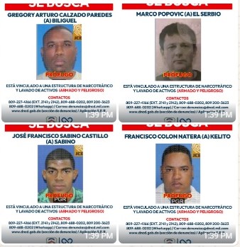 Las autoridades identificaron a los prófugos como el serbio Marco Popovic y los dominicanos Gregory Arturo Calzado Paredes (Biliguel), José Francisco Sabino Castillo (Sabino) y Francisco Colón Natera (Kelito), quienes son requeridos mediante órdenes judiciales para responder a las acusaciones en su contra.