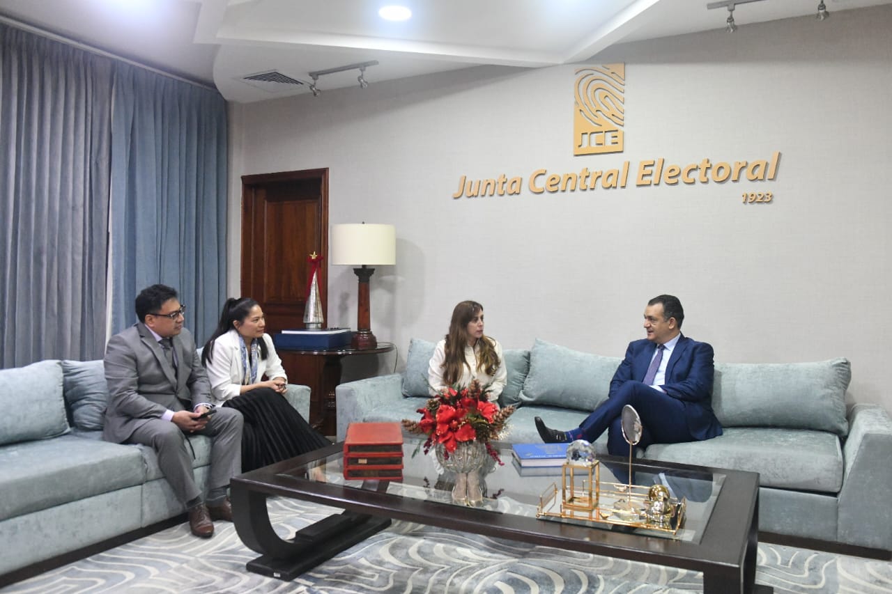 El encuentro se llevó a cabo en el despacho del presidente del órgano electoral, Jáquez Liranzo, y contó con la participación de María T. Mellenkamp, oficial a cargo del Departamento de Sustentabilidad Democrática y Misiones Especiales de la OEA, así como de los consultores Giuliana Kaneko de la Rosa y Jorge Kaneko de KM CORP S.A.C.