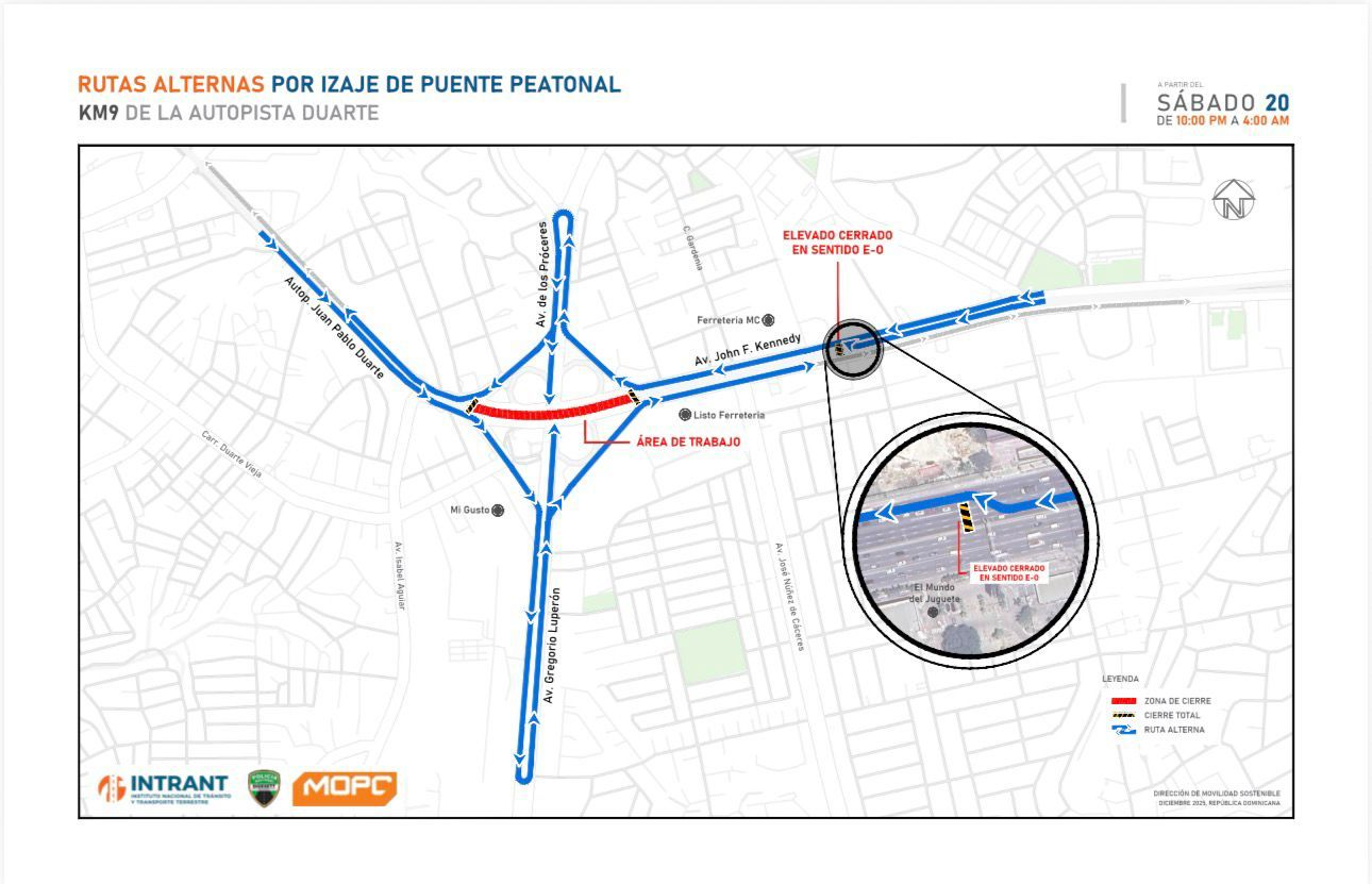 Durante el horario indicado, el tránsito será canalizado por rutas alternas debidamente señalizadas, con el apoyo de agentes de la Dirección General de Seguridad de Tránsito y Transporte Terrestre (DIGESETT), en ese sentido, los conductores que se desplacen de Este a Oeste deberán tomar el ramal de la Autopista Duarte hacia Los Próceres y realizar el retorno en la entrada de Los Ríos, mientras que quienes transiten de Oeste a Este deberán tomar el ramal hacia el sur en la avenida Luperón, realizar el retorno por la calle Olof Palme y reincorporarse a la avenida John F. Kennedy.