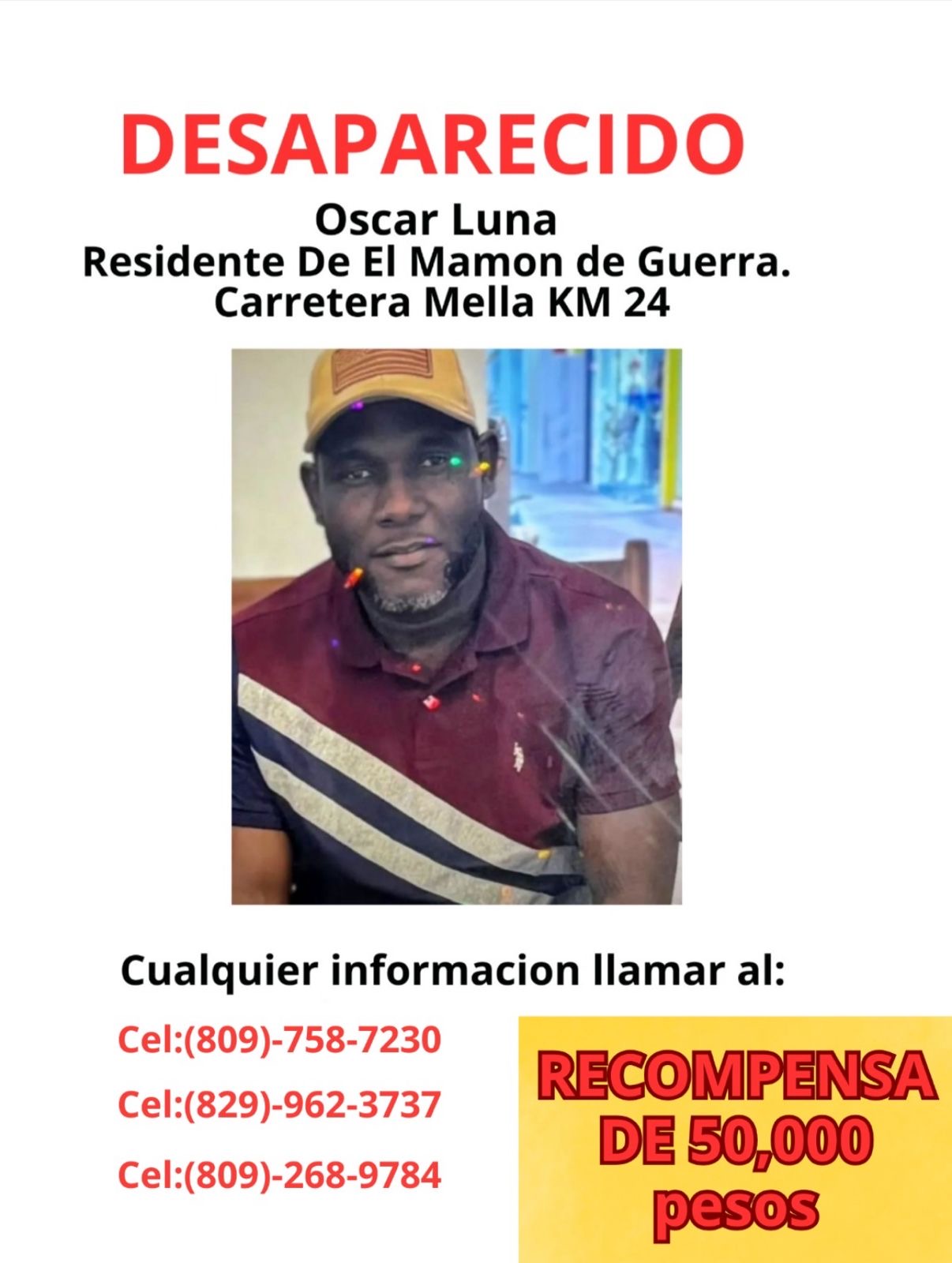 Santo Domingo, RD.- El señor Oscar Luna, residente en el sector El Mamón en Guerra, está desaparecido tras salir de su vivienda en horas de la mañana a bordo del vehículo de su hermana, quien le dio un "aventón" hasta la comunidad de San Luis. Allí lo dejó frente a una estación de combustible, y desde entonces no se ha vuelto a saber nada de su paradero.