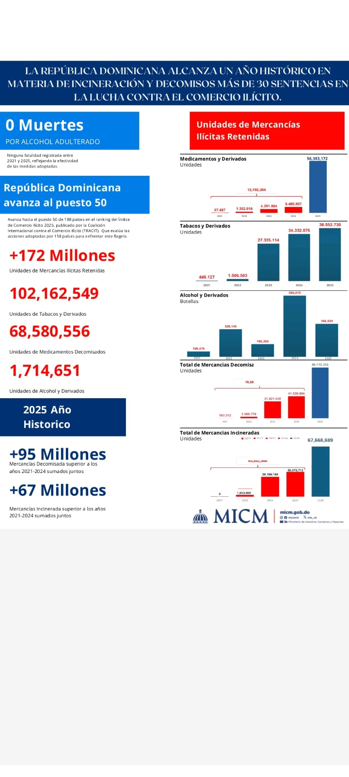 Las autoridades destacaron que estos resultados consolidan al 2025 como un año histórico en la lucha contra el comercio ilícito y reafirman el compromiso del Estado dominicano con la protección de la salud, la seguridad ciudadana, la competencia leal y el fortalecimiento de la economía formal.