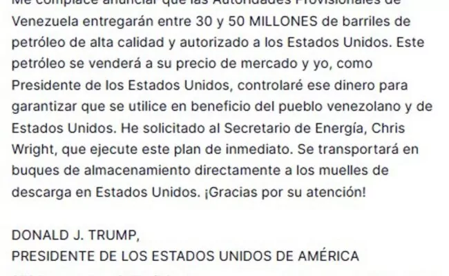 El mandatario calificó en una publicación de Truth Social los millones de barriles como “petróleo de alta calidad y autorizado en los Estados Unidos”.