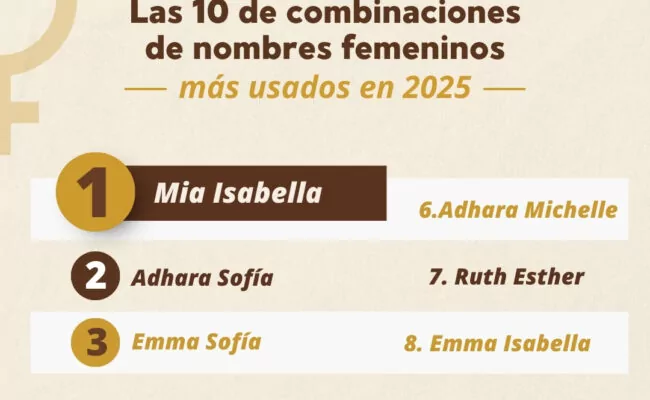Mientras que en las combinaciones femeninas predominaron Mia Isabella, Adhara Sofía, Ruth Esther y Emma Sofía.