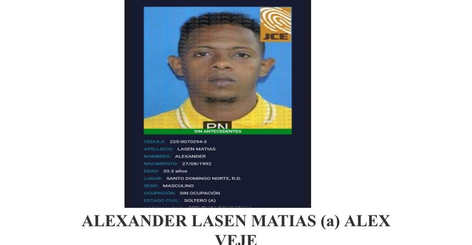 Santo Domingo, RD.- La Policía Nacional informó que este lunes se entregó de manera voluntaria Alexander Lasen Matías (Alex Veje), quien era buscado como parte del proceso investigativo relacionado con la muerte por arma de fuego de una mujer, ocurrida en el sector Villa Mella, municipio Santo Domingo Norte.