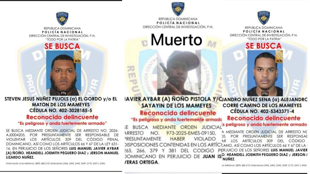 Las autoridades identifican a los presuntos agresores como José Alejandro Núñez Sena, alias “Alejandro” o “El Corre Camino de Los Mameyes”, y Steven Jesús Núñez Pujols, conocido como “El Gordo” o “El Matón de Los Mameyes”. La víctima mortal fue Luis Manuel Javier Aybar, alias “Ñoño”, mientras que su acompañante resultó herido en un brazo y recibe atención médica.