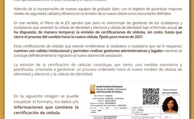 En ese sentido, el Pleno de la JCE, para no interrumpir las gestiones de los ciudadanos y ciudadanas que necesiten la cédula de identidad y electoral bajo el formato actual, dispuso de manera temporal la emisión gratuita de certificaciones de cédulas, hasta que finalice el proceso de cambio hacia la nueva cédula, previsto para marzo de 2027.
