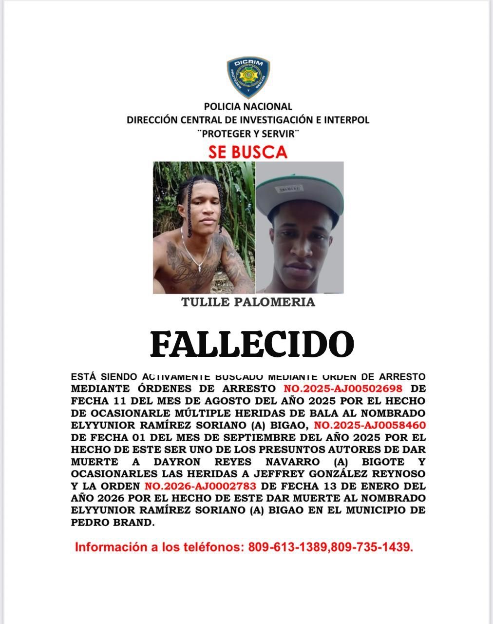 Entre las órdenes que pesaban en su contra se encuentran la No. 2025-AJ00502698, de fecha 11 de agosto de 2025, por ocasionar una herida de bala a un ciudadano; la No. 2025-AJ0058460, del 1 de septiembre de 2025, por la muerte de una persona; y la No. 2026-AJ0002783, del 13 de enero de 2026, relacionada con otro hecho homicida ocurrido en el municipio de Pedro Brand.
