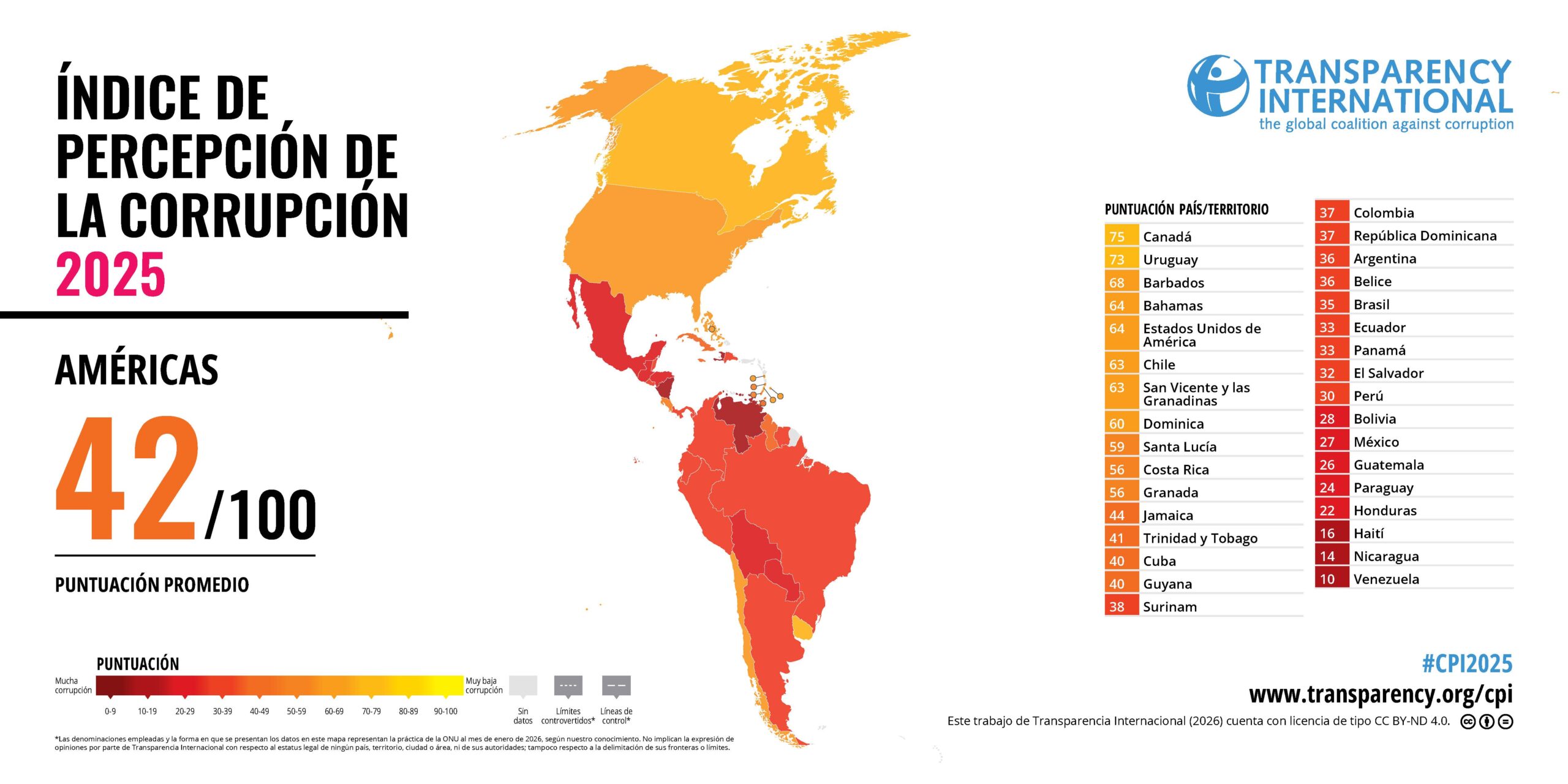 En el índice de Transparencia Internacional se afirma que, durante años, la corrupción ha permitido que el crimen organizado transnacional se infiltre en la política de países como México (puesto 27), Brasil (puesto 35) y Colombia (puesto 37), fomentando la impunidad y las injusticias.