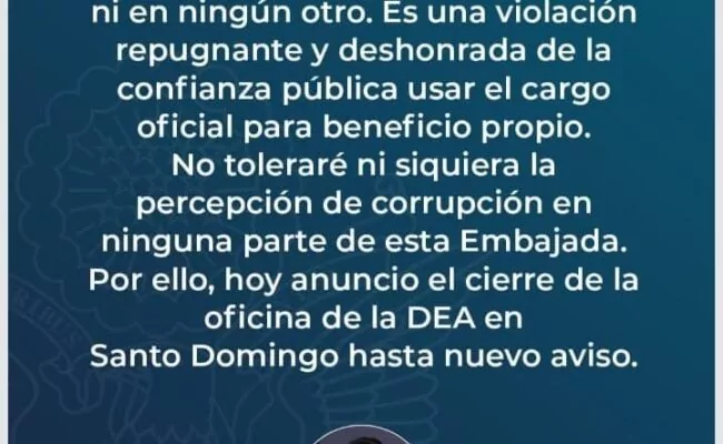 Santo Domingo, – Leah F. Campos, embajadora de los Estados Unidos en Republica Dominica, anunció mediante un comunicado oficial el cierre hasta nuevo aviso de la oficina de la Administracion de Control de Drogas (DEA por sus siglas en inglès) por estar vinculada en actos corruptos en Santo Domingo.