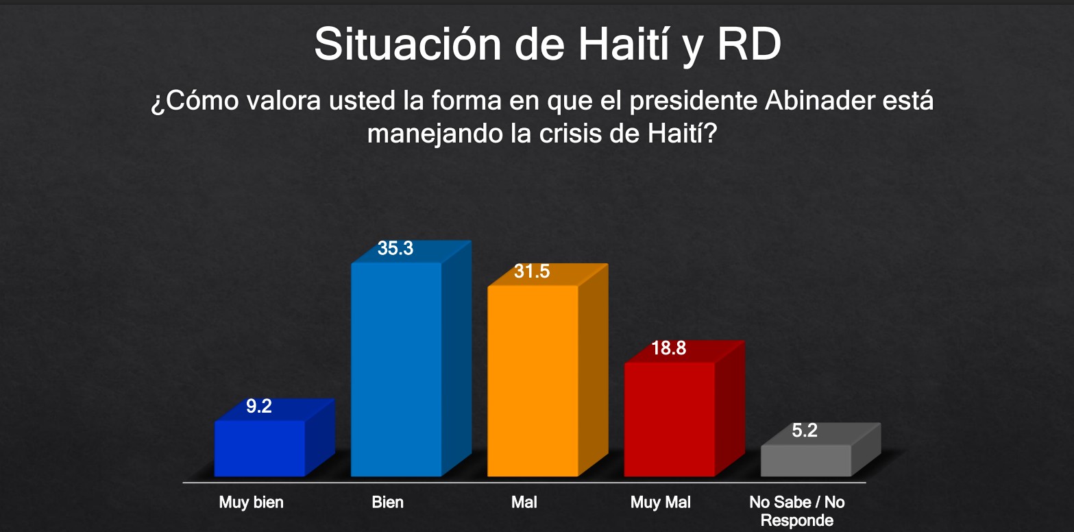 La encuesta de ACD Media, publicada este lunes y realizada entre el 7 y el 9 de febrero con una muestra de 1,200 ciudadanos, revela que el 44.5 por ciento de los entrevistados considera que el presidente Luis Abinader maneja "muy bien" o "bien" la crisis haitiana.