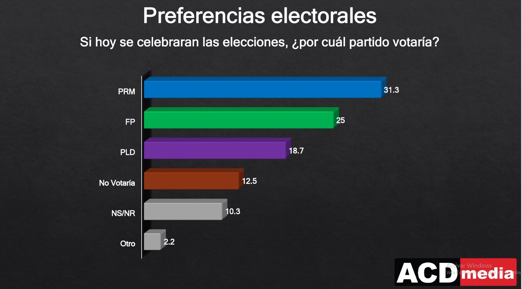 En la encuesta de ACD Media, cuyos resultados se publicaron el lunes en el programa "Ahora por la Mañana" de Ahora TV, Canal 3, y en la emisora La Súper 7, se determina que la Fuerza del Pueblo supera al Partido de la Liberación Dominicana en las simpatías de la población.