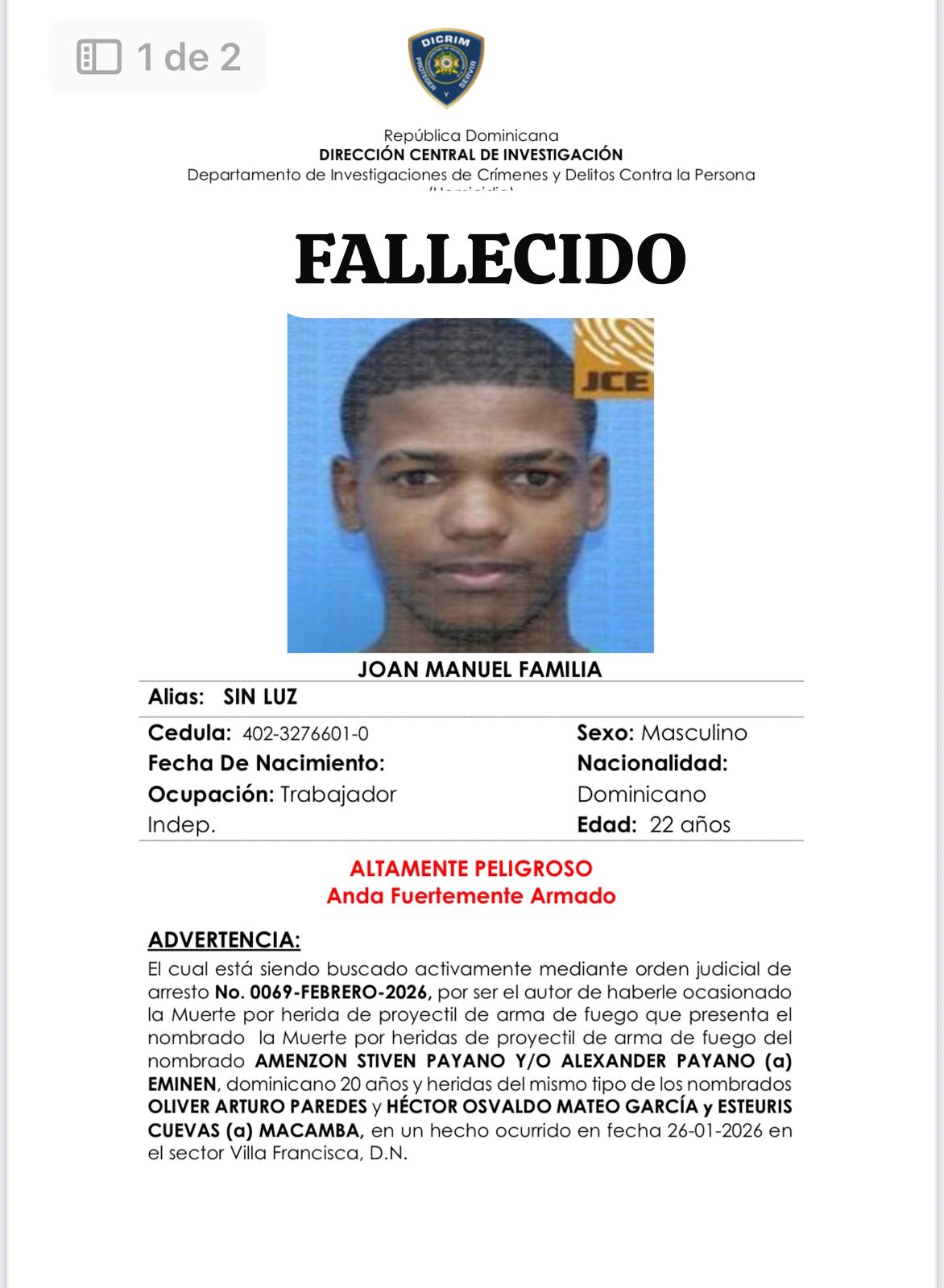 El hoy occiso era señalado como presunto autor de la muerte por herida de bala de Amezón Stiven y/o Alexander Payano, alias “Eminen”, así como de ocasionar heridas del mismo tipo a Oliver Arturo Paredes, Héctor Olvardo Mateo García y Esteuris Cuevas, alias “Macamba”, en un hecho ocurrido en fecha 26/01/2026 en el sector Villa Francisca, Distrito Nacional.